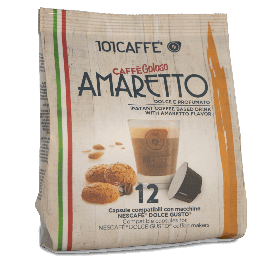 Découvrez le plaisir unique d’une préparation soluble de haute qualité, avec café, pour une boisson au saveur d’amaretto,en capsules compatibles, inspirée de l’un des biscuits les plus emblématiques de la tradition italienne: douce, parfumée et irrésistible. Le goût intemporel d’une pâtisserie répandue dans toute l’Italie et appréciée dans le monde entier, que 101CAFFE’ a réinterprété en l’associant au café pour offrir une tasse gourmande à la crème onctueuse. Un seul geste pour revivre l’expérience authentique de l’amaretto. Capsules compatibles avec les machines à café Nescafé® Dolce Gusto®.