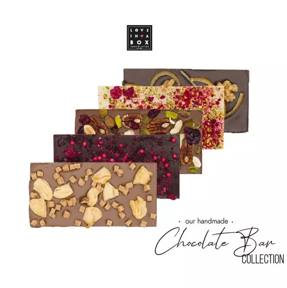 •La gamme de barres chocolatées Love in a Box Chocolate se compose de diverses barres chocolatées faites à la main. Nous sélectionnons les meilleurs ingrédients pour ces tablettes de chocolat et créons les plus belles combinaisons de saveurs. Original, classique et surprenant est notre devise. Chacun est parfait à combiner avec du café, du thé, du vin ou une autre boisson rafraîchissante !