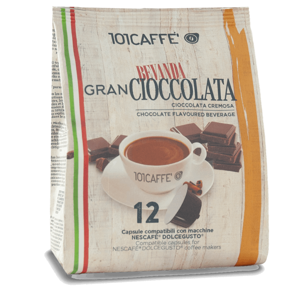 La Gran Cioccolata de 101CAFFE’ est une préparation soluble pour une boisson au chocolat au gout sucré, savoureux et intense. A’ déguster chaud d’un geste simple et pratique, en grande tasse également, car chaque capsule contient 18 grammes de produit, au lieu de 7 grammes. Capsules compatibles avec les cafetières Nescafè® Dolce Gusto.