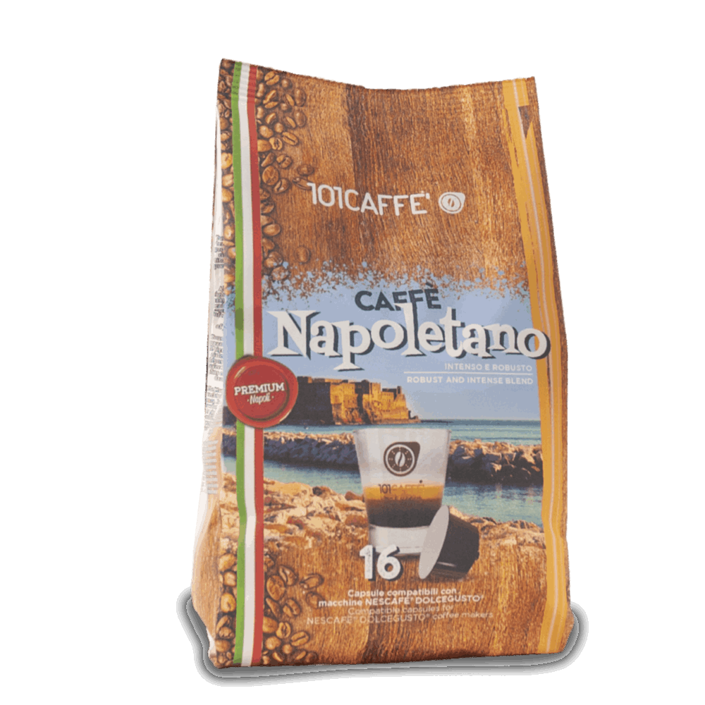 Le café Napoletano de 101CAFFE’ est un mélange de café 100% Robusta sélectionné de différentes provenances, torréfié selon l’ancienne tradition napolitaine, pour un café noir et crémeux. L’Espresso pour ceux qui aiment goûter toute la force du grain de café, qui se transforme en élixir de délicatesse en tasse. Parfait pour ceux qui aiment un goût intense et robuste, avec une crème riche de couleur noisette et de notes grillées, avec de fortes notes de cacao. Capsules compatibles avec les cafetières Nescafè® Dolce Gusto.